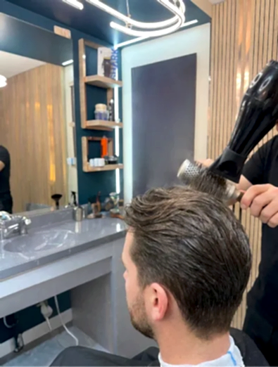 Erkek saç kesiminde yüz şekline ve saç tipine uygun, düzenli ve temiz kesimler yapıyoruz.